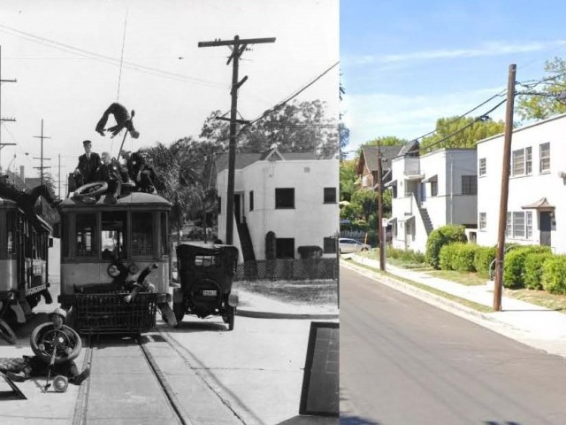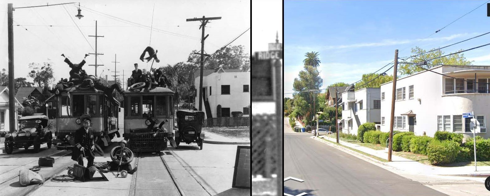 Long story short, after crowd-sourcing ideas with Charley and Pacific Electric trolley author Steve Crise, we confirmed these 1939 photos were staged along Douglas Street, a mere 81 years ago, in the hills appropriately adjacent to Echo Park, where so many Keystone comedies took place.