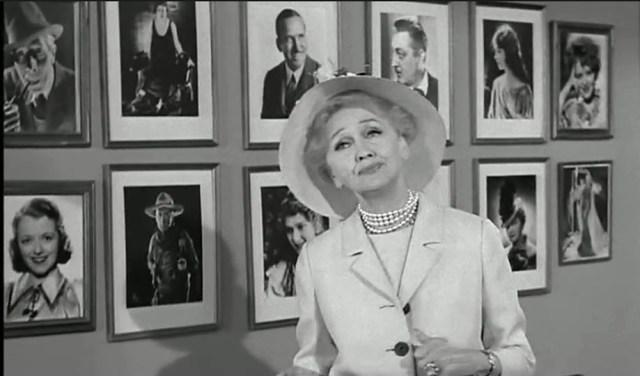 Within her office, Hedda delivers an impassioned appeal. “Mammoth Pictures is more than just a valuable piece of real estate. It’s a priceless chapter of Hollywood history, written by stars who the world will never, never forget. … a studio so rich in memories should and must be preserved.” Behind Hedda, left to right top row, are George Arliss, possibly Marie Dressler (thanks Steve Massa – can anyone confirm?), Douglas Fairbanks, John Barrymore, Lillian Gish, and Clara Bow. The bottom row, left to right, are Janet Gaynor, Wm. S. Hart, Mary Pickford, Rudolph Valentino (blocked from view), Hedda Hopper herself, and Mae West, confirmed by reader Patrick Foran. [Note: a reader shared Buster Keaton and Hedda both died the same day, February 1, 1966.]