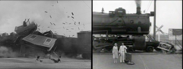 Above upper left, Mary’s rescuers arrive at Wiseburn, matched with Intolerance upper right, as friends halt the Governor’s train, seeking his last-minute reprieve from execution for the innocent, wrongly condemned Robert Harron (The Boy). Below, speeding directly toward the camera, Buster arrives in style at Wiseburn during The Goat, one of Keaton’s most iconic scenes.