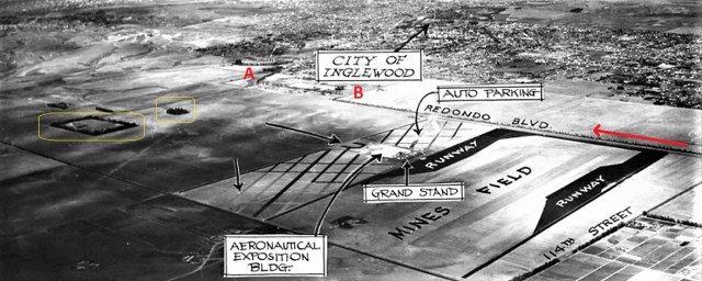 A 1929 NE view of developing Mines Airfield. The five scenes above were staged looking north along Redondo (now Aviation) Blvd. (arrow), with the distinctive windbreak trees once standing south of W. Manchester Ave. marked in yellow. Mostly running parallel to the tracks, the dirt road splits away from the tracks at a 60 degree turn “A” above, then rejoins the tracks with two 90 degree turns, “B” above, discussed further below. LAPL.