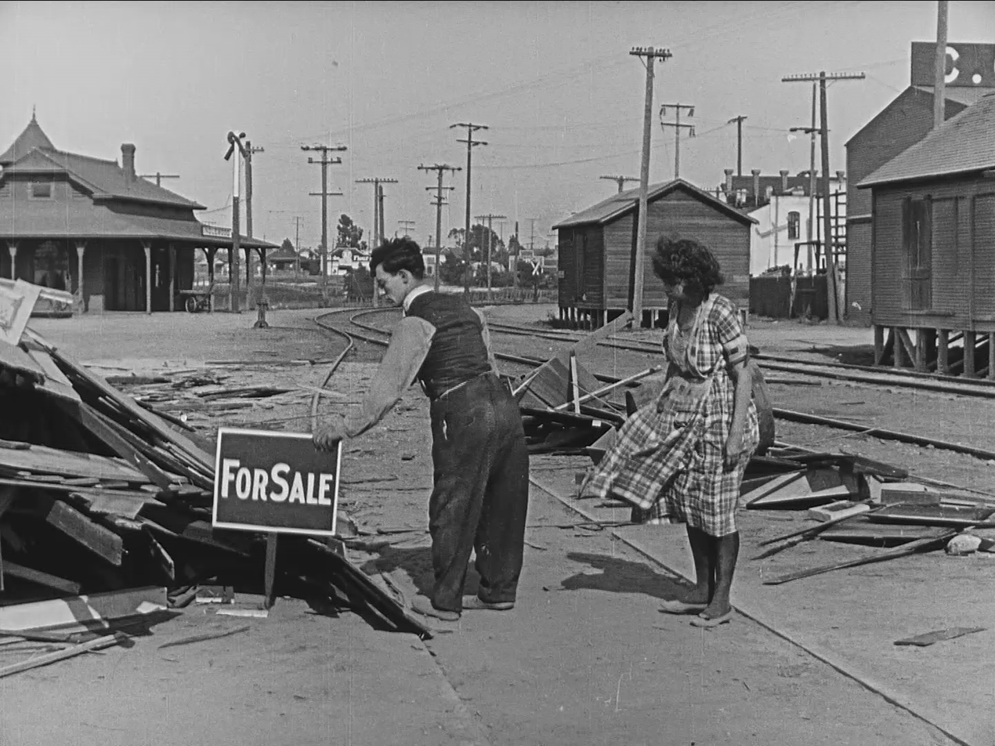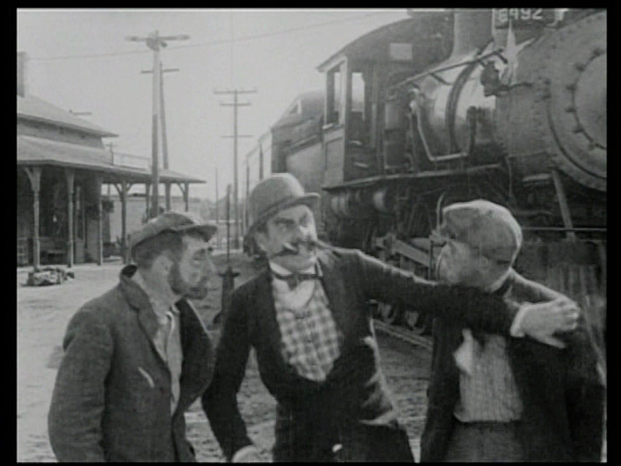 The large warehouse, with central doorway appearing behind Edwin, stands roofless nine years later as Buster’s train heads west from Inglewood in The Goat.
