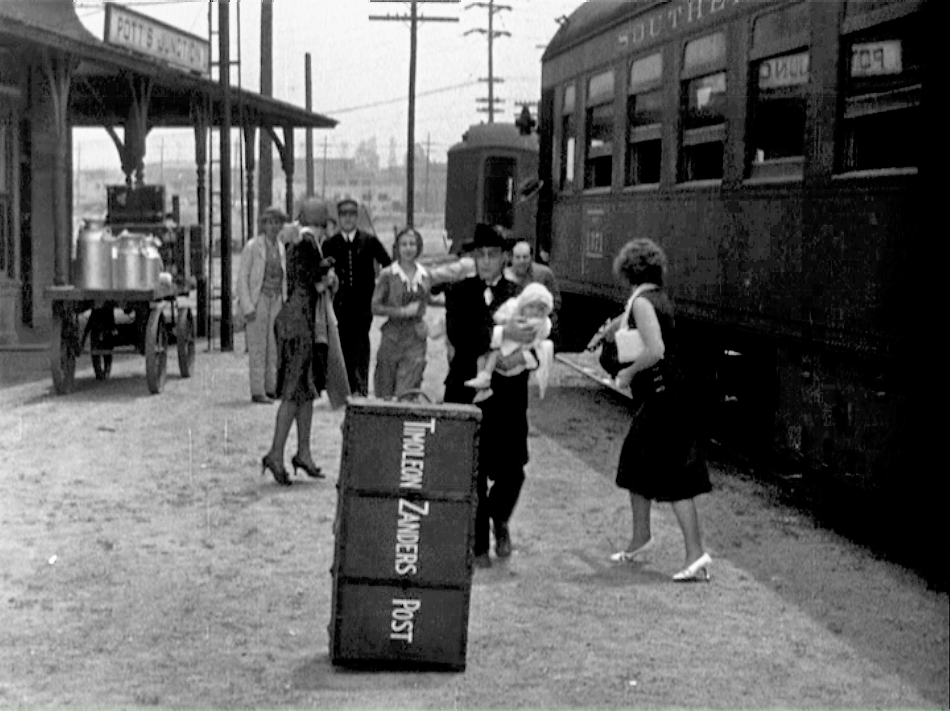 Without access to a car, Edwin and the police convince an engineer to follow Mary in his locomotive. Looking east, once the train departs the station, it reveals the C. Ganahl Lumber Co., also appearing when Buster Keaton tows his house north up Eucalyptus Ave. across the tracks at the conclusion of One Week (1920).