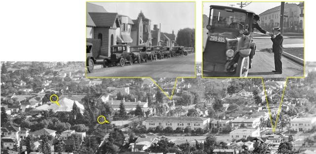 Jumping a decade ahead, here’s a view east of the Chaplin Studio during the production of The Circus (1928). Note how La Brea bends left (NW) at Sunset, the remaining orchard and tennis court beside Syd’s 7062 Sunset Boulevard mansion, and the giant circus tent set. Buster Keaton filmed a scene from Cops (1922) at the corner of Sunset and Detroit at the lower left of this view – more below. Charlie Chaplin Archive.