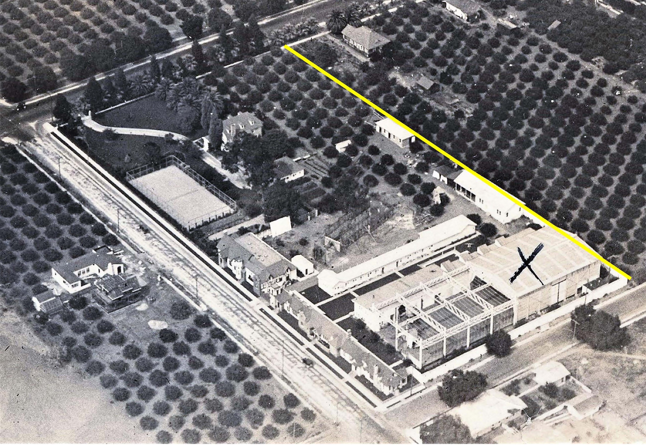 Looking NE – 7022 Sunset, the home to the right of the yellow line, had 10 rows of citrus trees. To the left of the yellow line, 7 rows of trees stand on the Chaplin Studio. Note Syd Chaplin’s multi-gabled mansion beside the studio tennis court. The studio address is 1416 N. La Brea, now home to the Jim Henson Company. Charlie Chaplin Archive.
