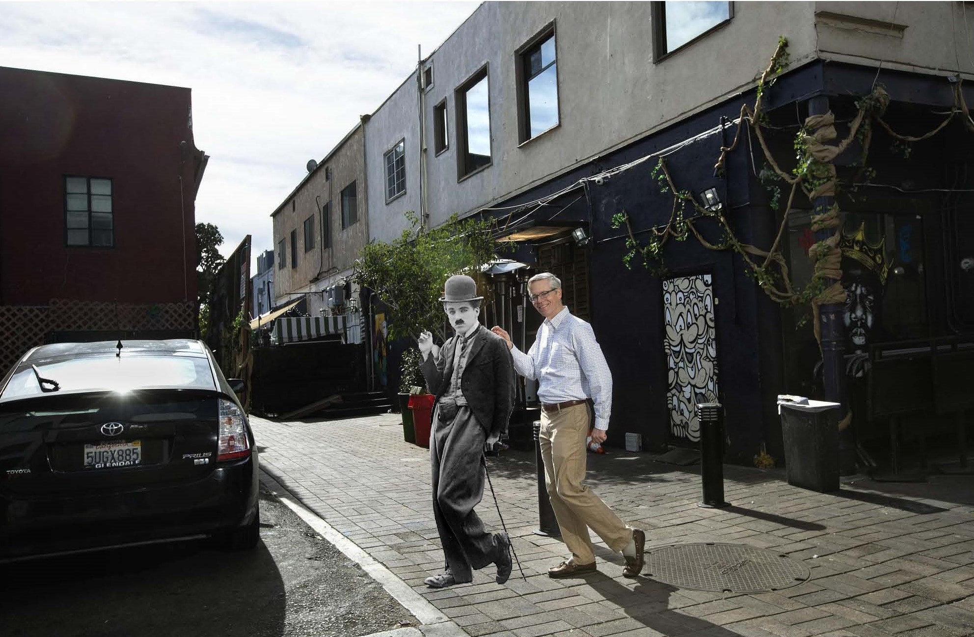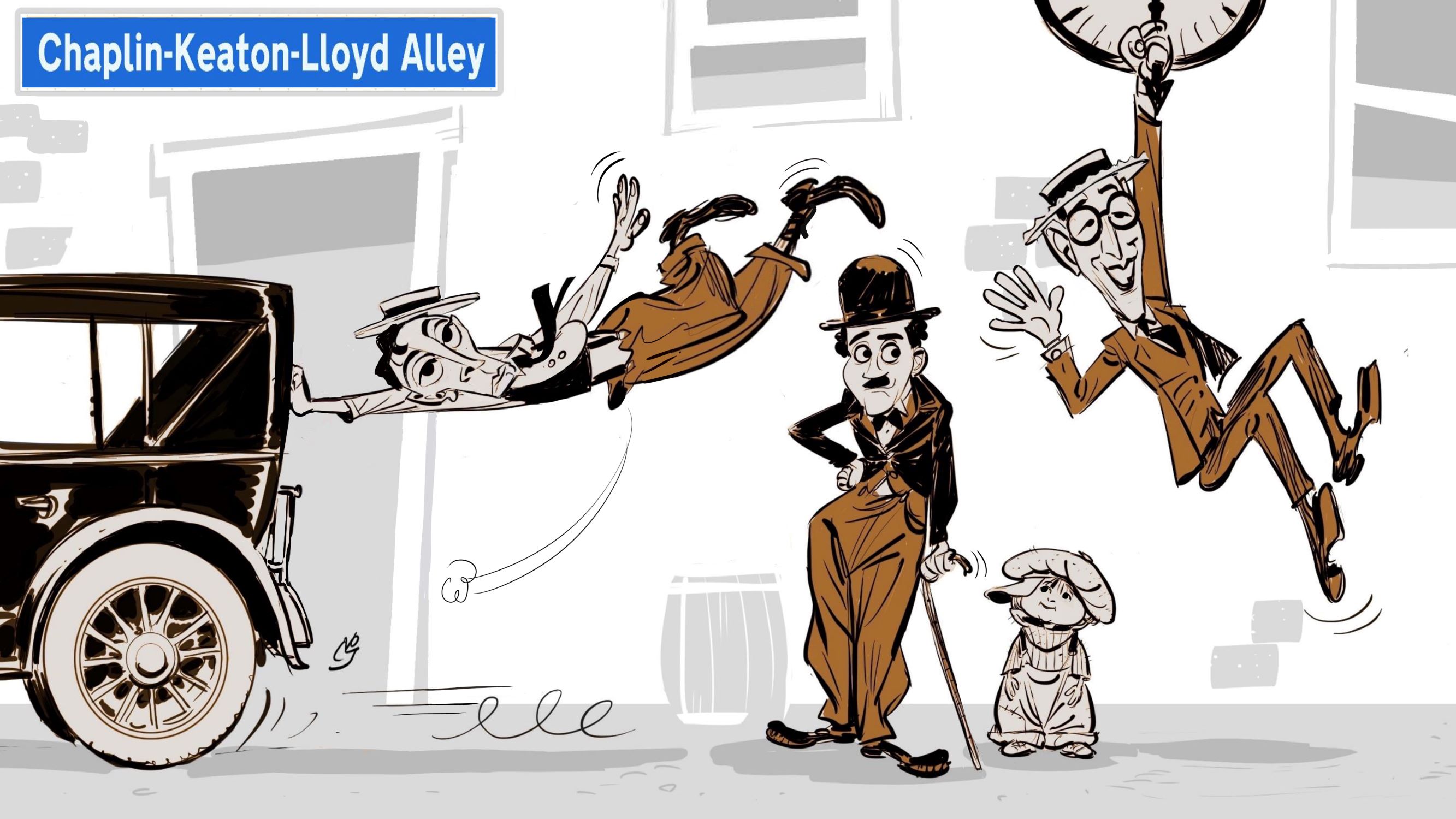 Award-winning animator and wickedly funny caricaturist Patrick Mate has joined the campaign to name the Chaplin-Keaton-Lloyd Alley with this delightful cartoon, capturing the spirit of The Kid, Cops, and Safety Last! with a single image. A French-born DreamWorks Animation veteran and Smurf designer, Patrick worked recently illustrating filmmaker Daniel Raim’s documentaries Image Makers, chronicling pioneering cinematographers such as Gregg Toland, Rollie Totheroh, and James Wong Howe, and the acclaimed Harold and Lillian: A Hollywood Love Story, rated 97% “Fresh” on RottenTomatoes.