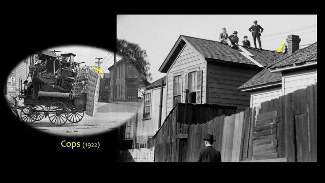 Above, behind the unique triangular building once standing on Ducommun Street, as it appears in Buster Keaton’s Cops (1922), was the starting point for Charlie’s highly cinematic rooftop chase during The Kid.