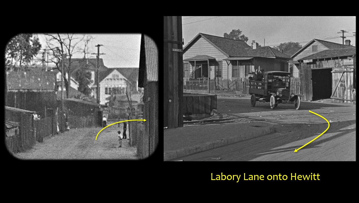 During Chaplin’s fight aboard the orphanage truck, they speed around an early working-class street corner east of downtown. Neither street survives today.