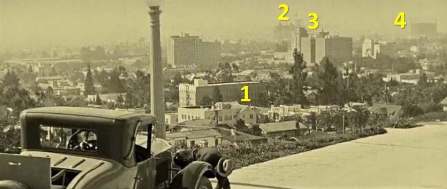 But there’s more – 1 is the Apartments on , 2 is the Warehouse, 3 is the Athletic Club, and 4 is the large gas holding tank at Las Palmas and Santa Monica Blvd., next to the Pickford-Fairbanks Studio.