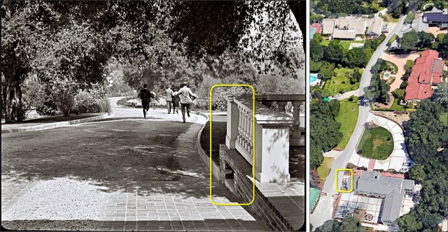 This panning shot shows the 1625 home situated on a developed street, lined with corners, curbs, sidewalks, lampposts, and landscaping. Aside from the sloped hill at back, and the other clues, presumably this home was relatively near La Canada Flintridge, as Buster and crew had to travel between the home and the “club” to capture the lap-dissolve shots.