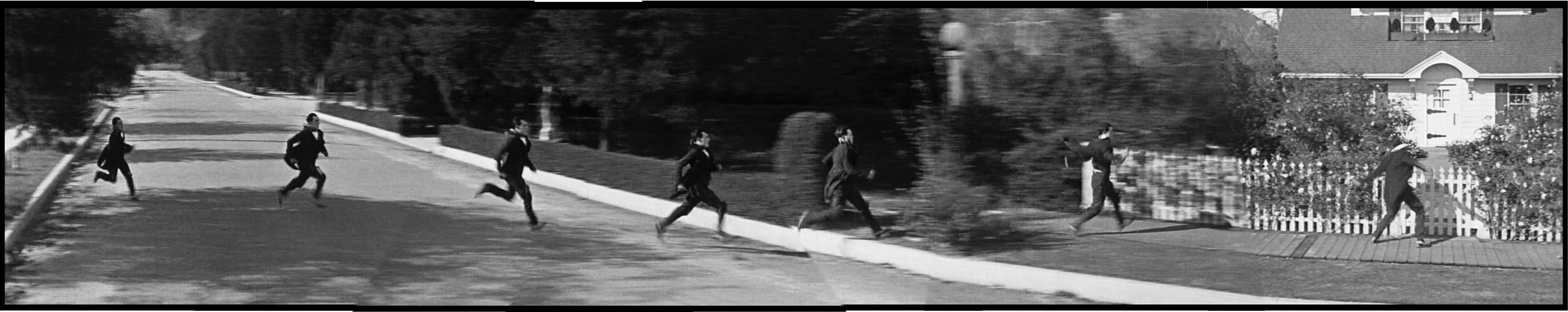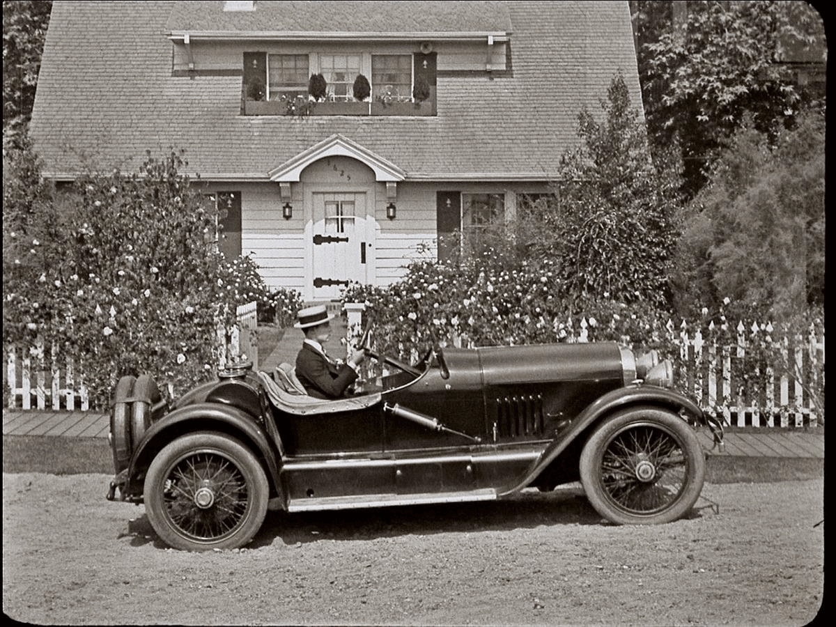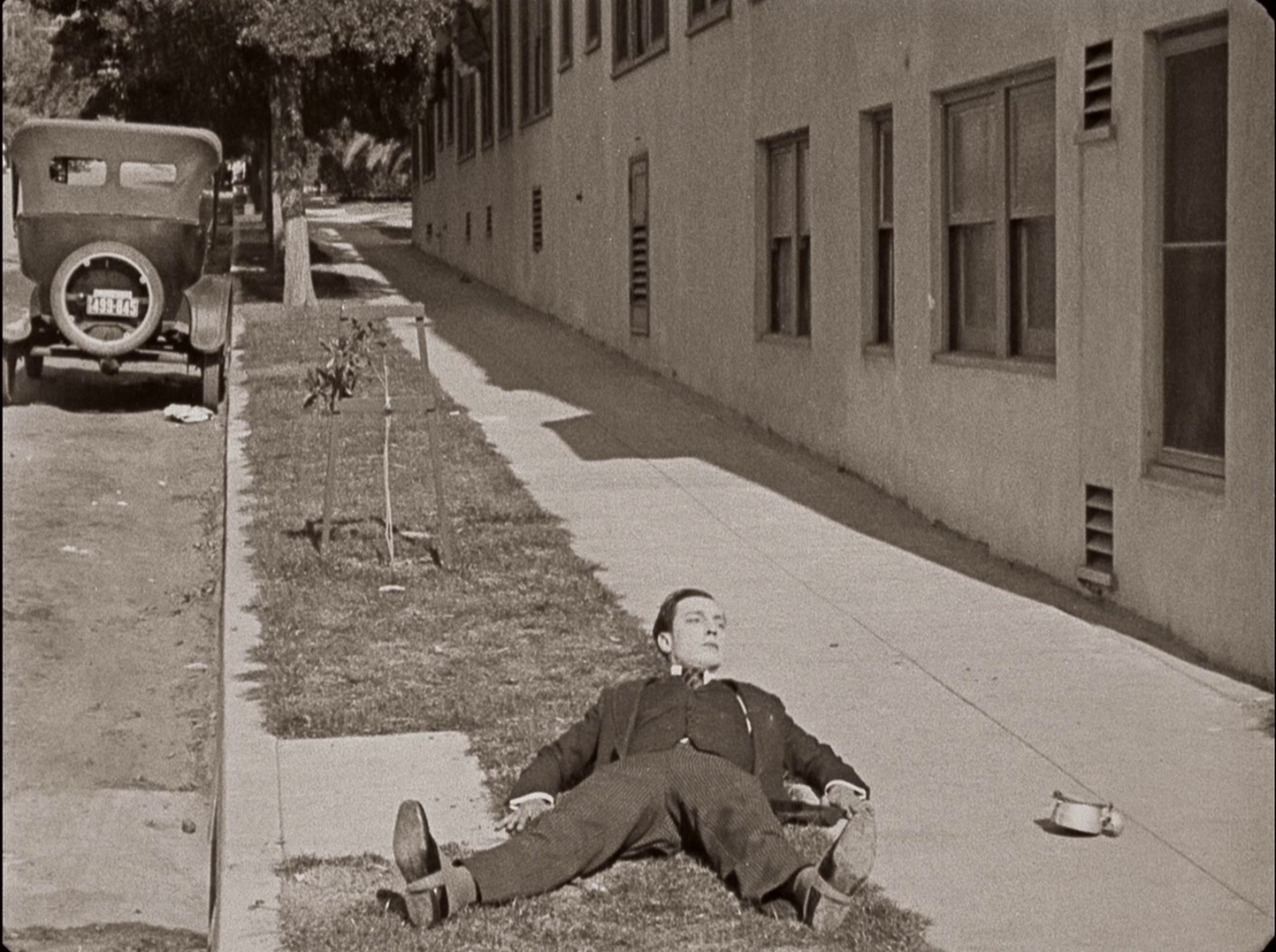 Rejected by his girl, portrayed by Ruth Dwyer, Buster leaves her home and then arrives at the club, presented onscreen with this stunning lap-dissolve transition. While this digital effect is now commonplace, Keaton had the foresight to envision it a century ago, and the skill to create it the old-fashioned way, by re-exposing the same film within the same camera, and using surveying equipment to assure the car was aligned in exactly the same position for both shots.