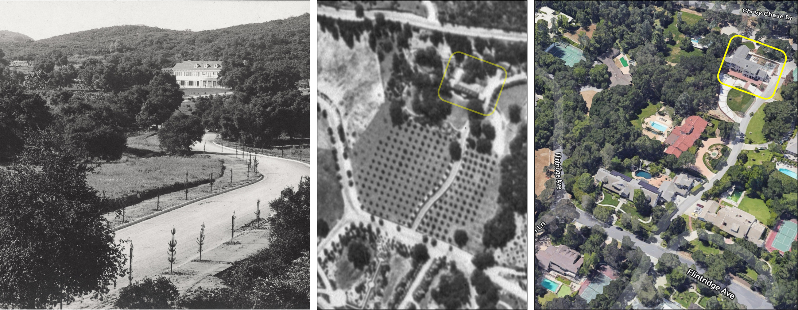 Click to enlarge – remodeled or completely rebuilt, the modern home site identifies now as 882 Flintridge Ave., and retains the same two-wing “L” shaped floor plan. Note the matching curved driveway and sloping front lawn. Central 1928 image UC Santa Barbara c-300_k-248.