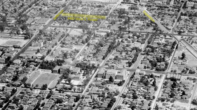 Above, this unique 1923 photo (click to enlarge), looking east at the then-small USC campus in the foreground, provides the answer. A popular film location site, especially with Buster Keaton (more below) I’ve studied dozens of aerial photos of the campus, which nearly always look north. National Archives – photo mislabeled as Pasadena – https://catalog.archives.gov/id/23935371