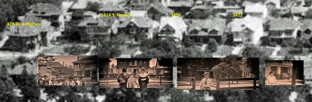 Two blocks east from USC, Penrod and Sam was filmed nearly entirely on the 3400 block of S. Flower between W. Jefferson Blvd. and 34th Street. The child Penrod lived at 3421 S. Flower next door to a genuine vacant lot (a critical part of the story). The once beautiful street was later devoured by the Harbor Freeway and the USC Galen Center.