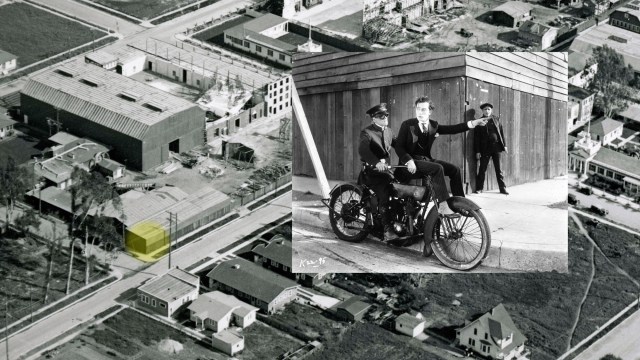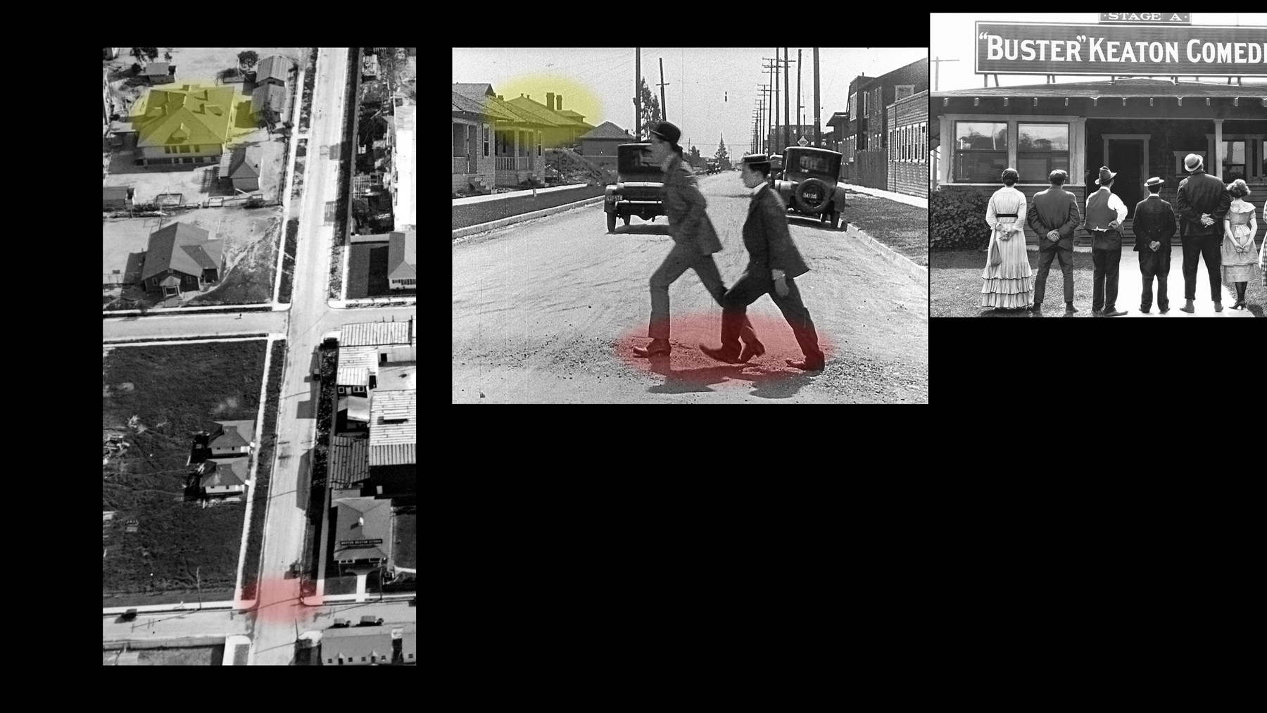 This famous publicity still was taken beside the corner of Keaton’s studio barn.