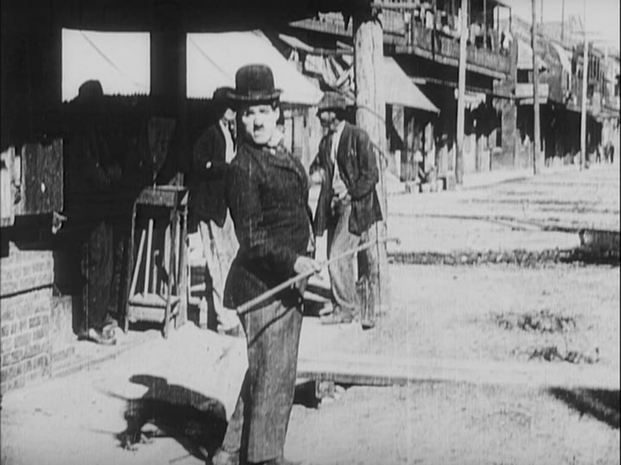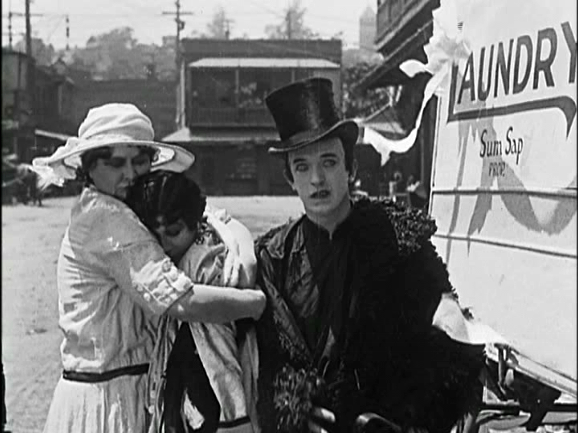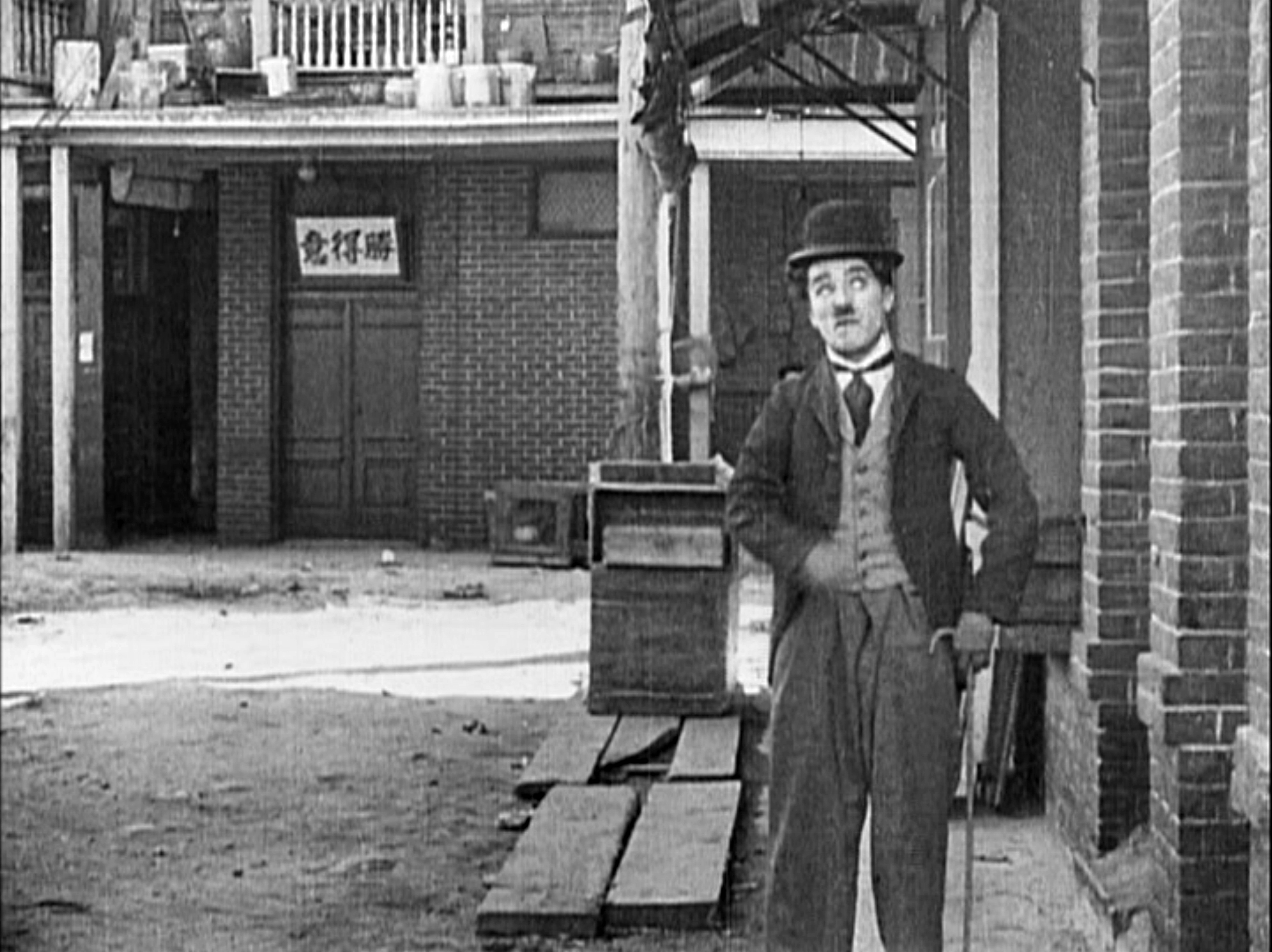 A wide view looking west down Apablasa, with The Kid/Soft Shoes alley corner at the left. Stan Laurel appears at right in Mandarin Mixup (1924). Chaplin filmed Caught In A Cabaret (1914) beside the central building at back. You can read more about Chaplin and Laurel filming in Chinatown on Apablasa (below) in this post HERE.