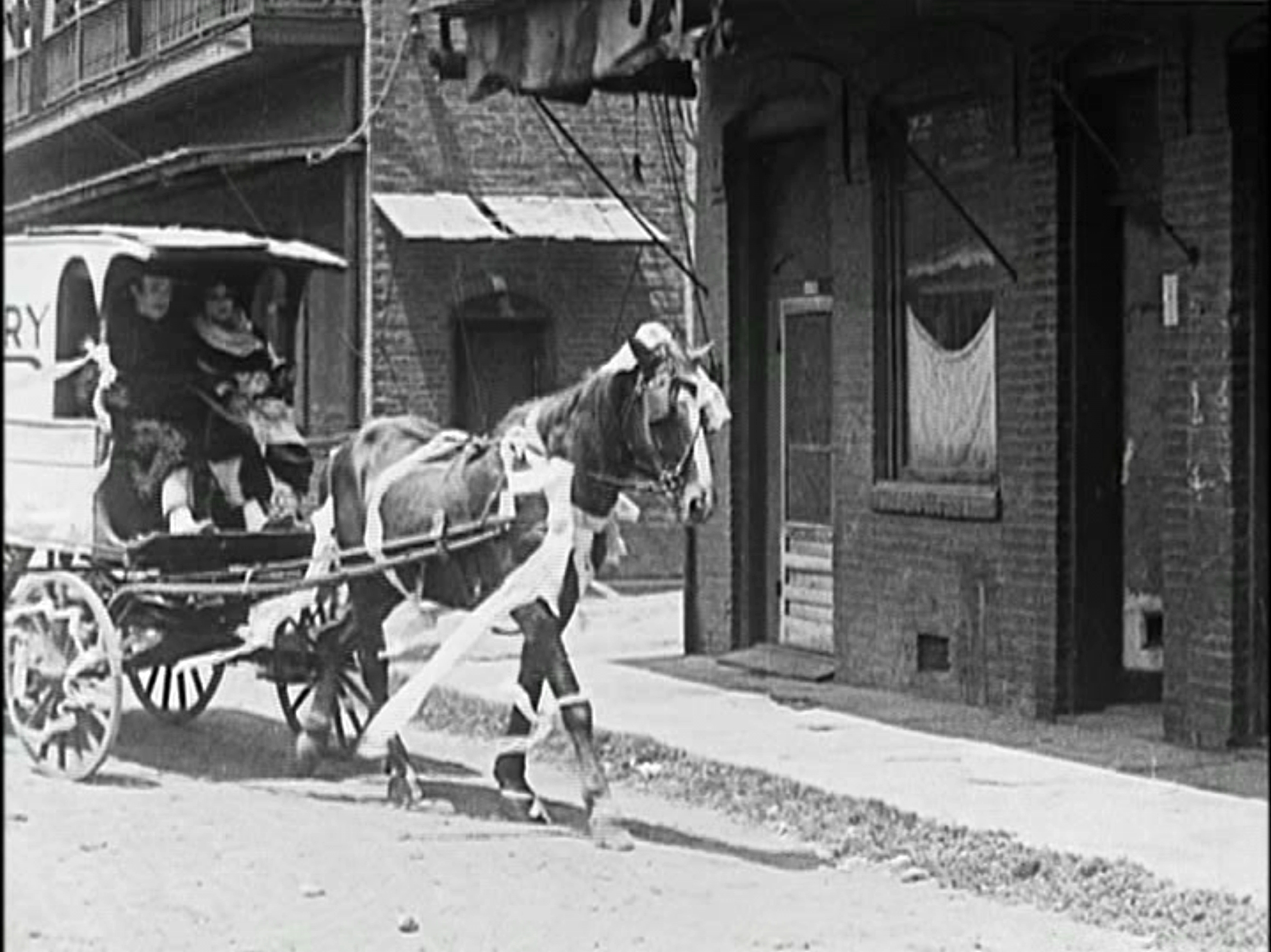 Click to enlarge. The “Billiards” building far right in the movie frame is newer, built after the photo was taken. The far right photo building says “BRADLEY” at the roof ledge, matching the Hotel Bradley in the movie frame. The J.N. Mooser Dry Goods building appears as Ocean Park Dry Goods in the movie frame. Note the matching sidewalk clock in both images.