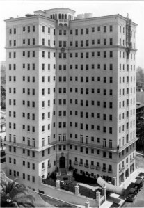 Built in 1913, the Bryson also appears prominently above Chaplin’s head during a scene from his Mutual comedy The Rink (1916), where Charlie meets Edna Purviance on the street at the SE corner of Wilshire Place and Ingraham (now Sunset Place). The Bryson may be best known as a setting described in Raymond Chandler’s 1943 Philip Marlowe detective classic The Lady in the Lake. Color photo Jeffrey Castel De Oro.