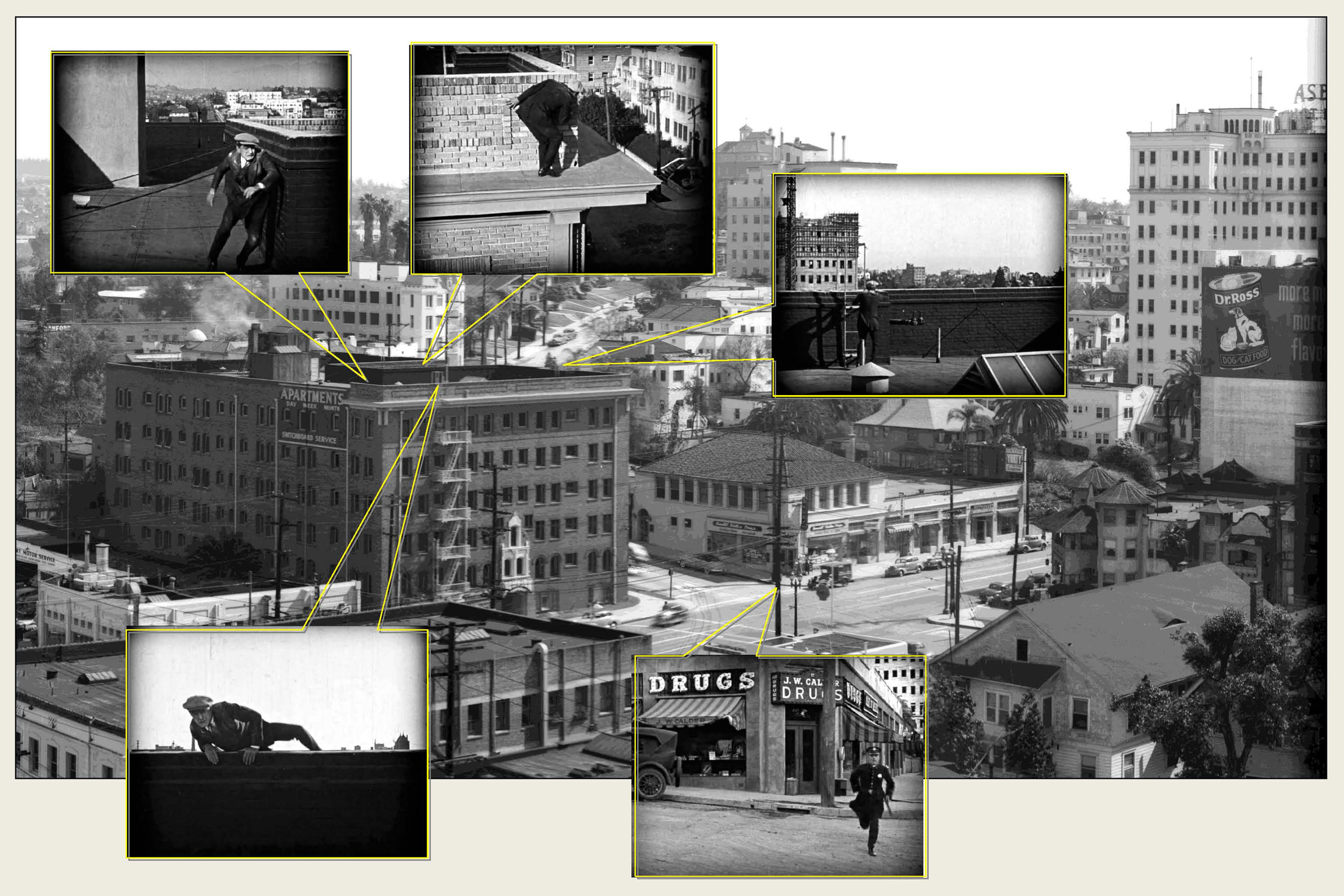 The view above looking NW from the Franconia roof (left) reveals a stretch of Rampart Boulevard, beginning with the Villa d’Este Apartments at 401 Rampart (A), to the corner of Rampart and W. 3rd Street (D), all appearing in Harold Lloyd’s For Heaven’s Sake (1926) (right, Harold with straw hat). As I explain in my Lloyd book Silent Visions, Harold filmed the drunken groomsmen bus scene, shown here, extensively on Rampart between 6th and 3rd, where nearly every building on the street appears onscreen and remains standing today. The Rampart corner (D) also appears in Lloyd’s Girl Shy (1924).