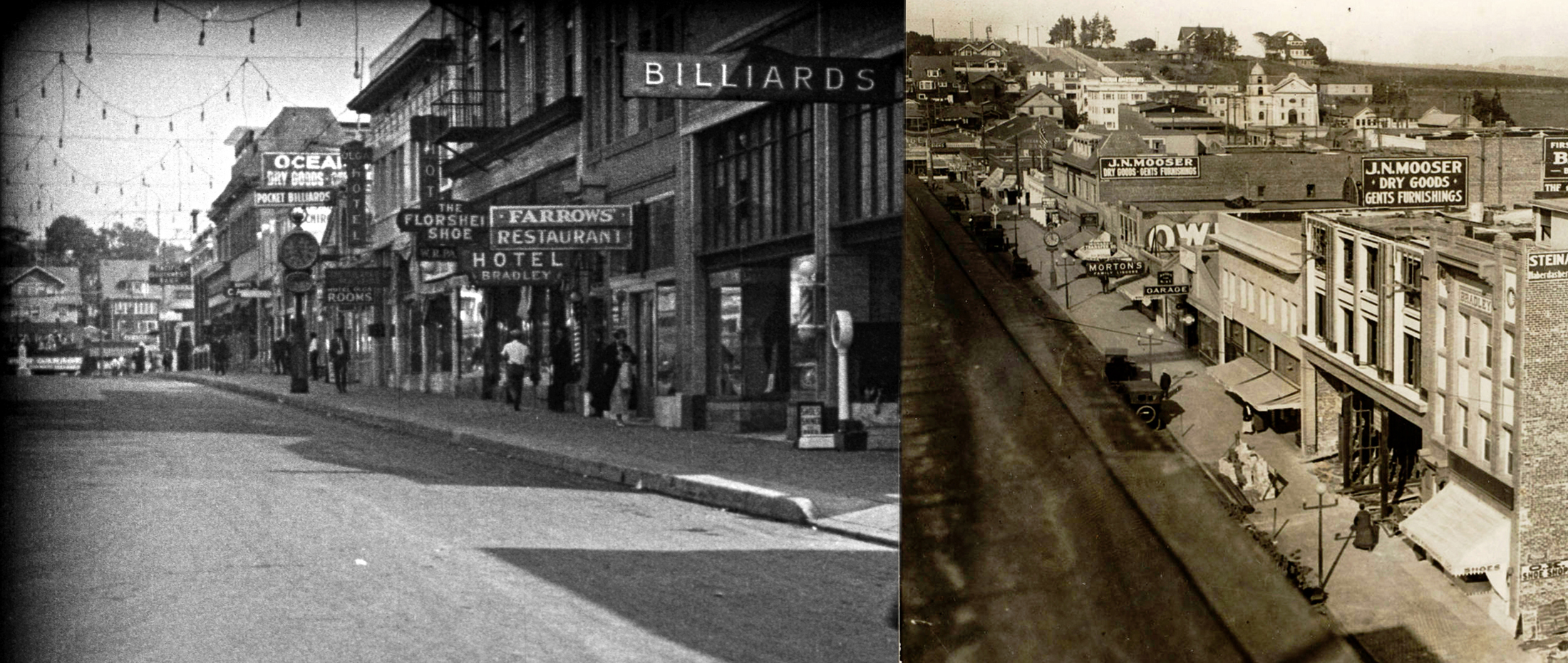 Click to enlarge. The “Billiards” building far right in the movie frame is newer, built after the photo was taken. The far right photo building says “BRADLEY” at the roof ledge, matching the Hotel Bradley in the movie frame. The J.N. Mooser Dry Goods building appears as Ocean Park Dry Goods in the movie frame. Note the matching sidewalk clock in both images.