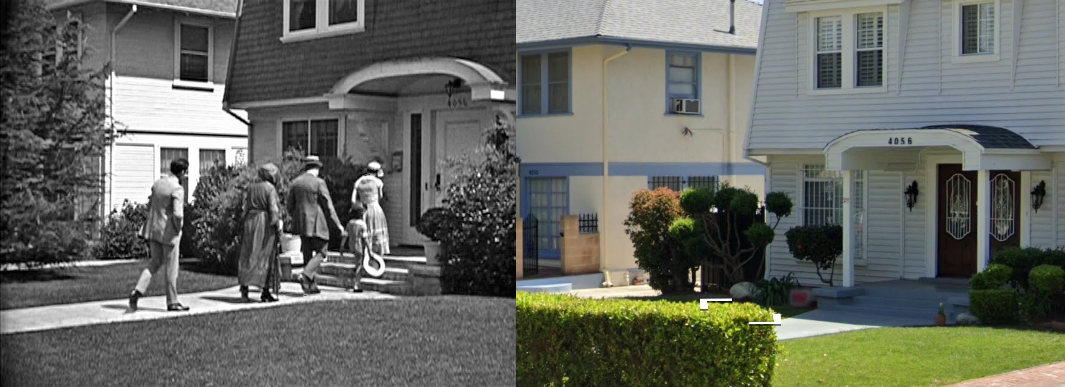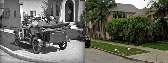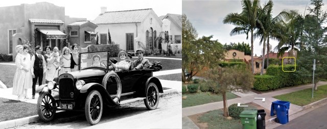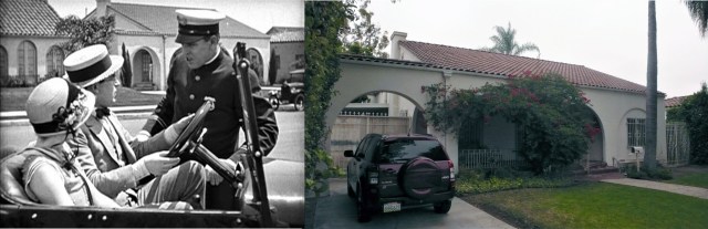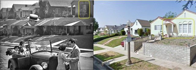 Above, Harold proudly presents the new family car to his wife portrayed by Jobyna Ralston, with 565 N Beachwood in the background. The distinctive trio of window arches were later removed. The audience was not expected to notice the discrepancy between the 4-digit address of the family home (4056), and the many 3-digit addresses appearing during the Beachwood scenes.