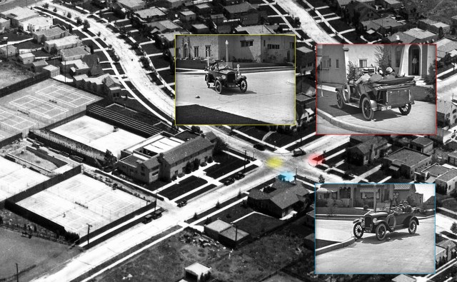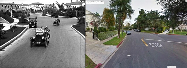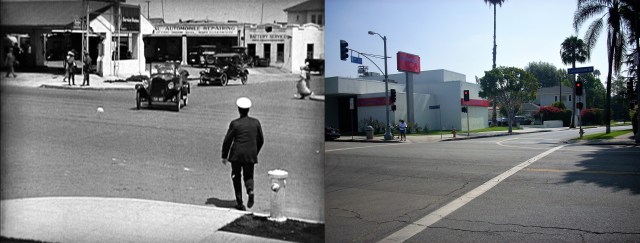 As I report at page 161 of my Harold Lloyd book Silent Visions, Harold immediately gets in trouble by turning left around the wrong side of a traffic button, here the NE corner of W 1st and S Larchmont.