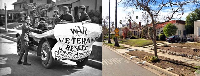 The big reveal, when the soldier stops to retrieve his helmet, this view looking south shows two-story 565 N Cahuenga at back. Decades later, the house portrayed the Cunningham family home during the hit 1970-80s sitcom Happy Days. But Harold filmed here first. Read all about the Happy Days home at Lindsay Blake’s I’m Not A Stalker filming locations website.