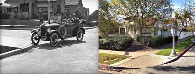 A far (left) and closer (middle) view of 565 N Beachwood, home to Harold’s friendly neighbor, who takes a photo portrait of the family in their new car. The Sanborn maps show the 565 home was originally “L” shaped, with only a front room to the right of the arched entrance. Now expanded, the remodeled home has front rooms on both sides of the front door.