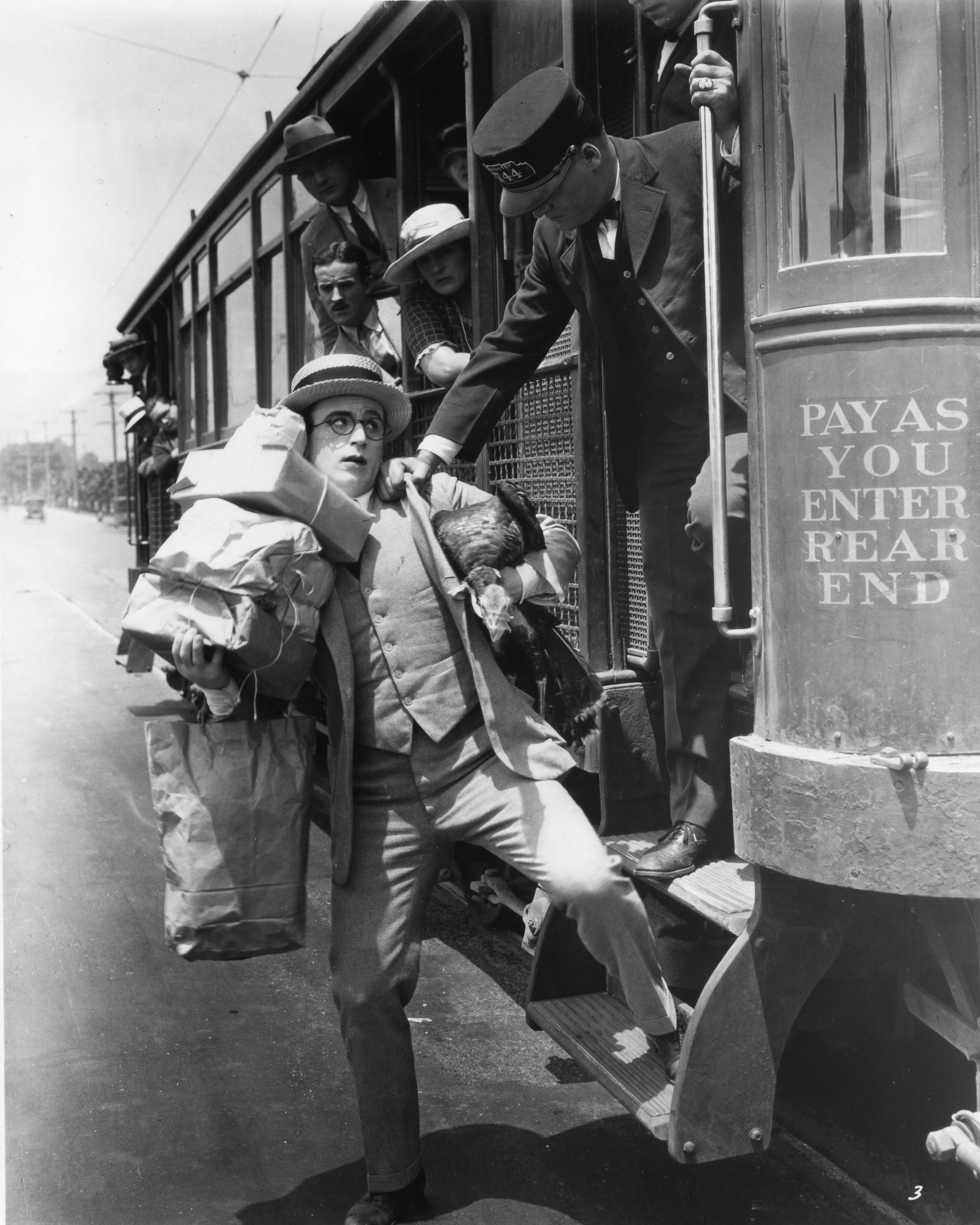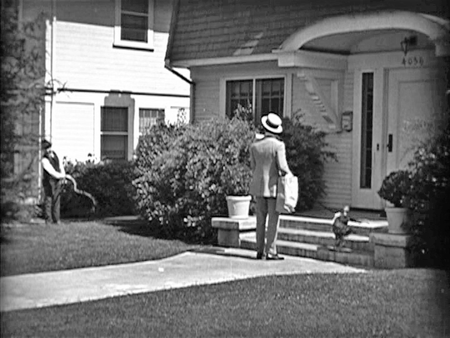 Hot Water, a parody of domestic bliss, is best known for its famous set pieces, including Harold’s attempt to ride a crowded streetcar while carrying armloads of groceries and a live turkey, and his disastrous inaugural outing in his new car, with his pesky in-laws in tow. Above Harold and live turkey arrive at 4056 W 7th Street, note the doorway address.