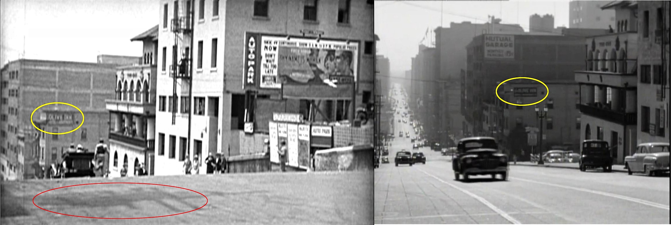 From here on all hell breaks loose, taking the family across S Lafayette Park Place, Santa Monica, and past the former Hollywood fire station, all as reported in my book. Another discovery, reported on my blog soon after my book came out, the car careens out of control down Olive St downtown, the Bunker Hill film noir locale appearing in the The Turning Point (1952) above right.