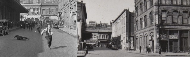 Back in LA, compare Jackie’s frame with a matching frame from The Kid. Both show the same “ARCADIA” street sign on the wall across the way (you can actually read it if you enlarge Charlie’s frame). To the right in both frames is Sanchez Alley, running north from Arcadia towards the Plaza de Los Angeles. The north end of Sanchez remains today, but the southern end of Sanchez, perpendicular to Arcadia, which ran north-south from Main St to Los Angeles St, were all demolished for a freeway. Mark’s blog has some great aerial views of this spot.