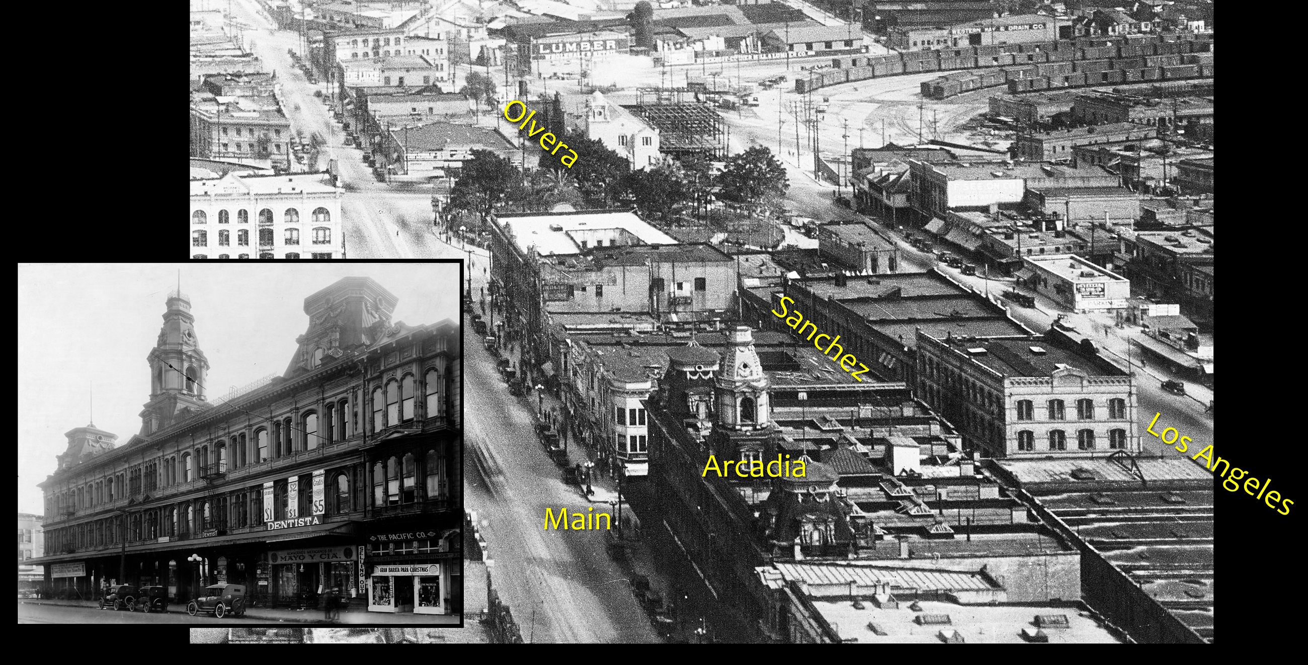 Above, facing the Arcadia entrance way, in a view looking SE, a friendly preacher checks on Jackie. The NW corner of the Hotel de Paris building appears behind him – note the matching twin-curves within single curve arch details in both images. The full photo looks north up Arcadia from Los Angeles St towards Main St, passing midway the south end of Sanchez Alley.