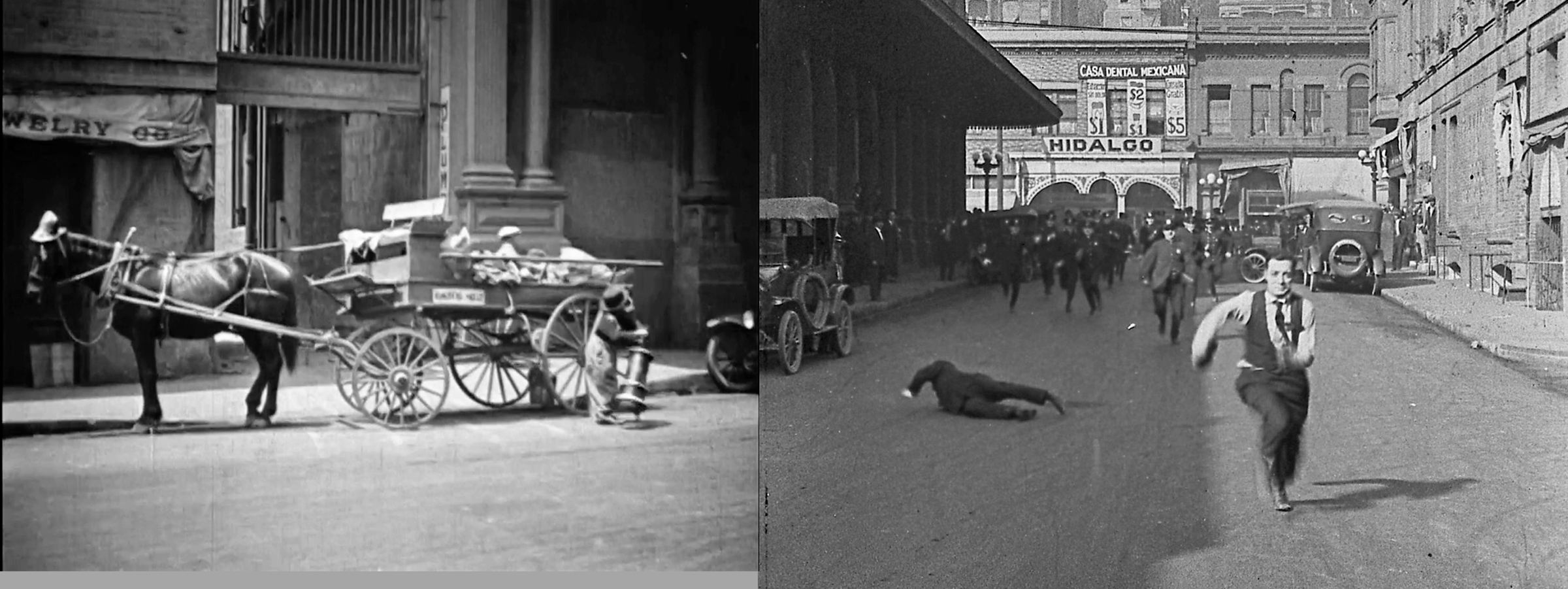 Click to enlarge – a panoramic view of the west side of Arcadia, with Harry Langdon in Feet of Mud (1924), the Plaza Jewelry Co. at 114 Arcadia, Jackie (center) and Buster at right.