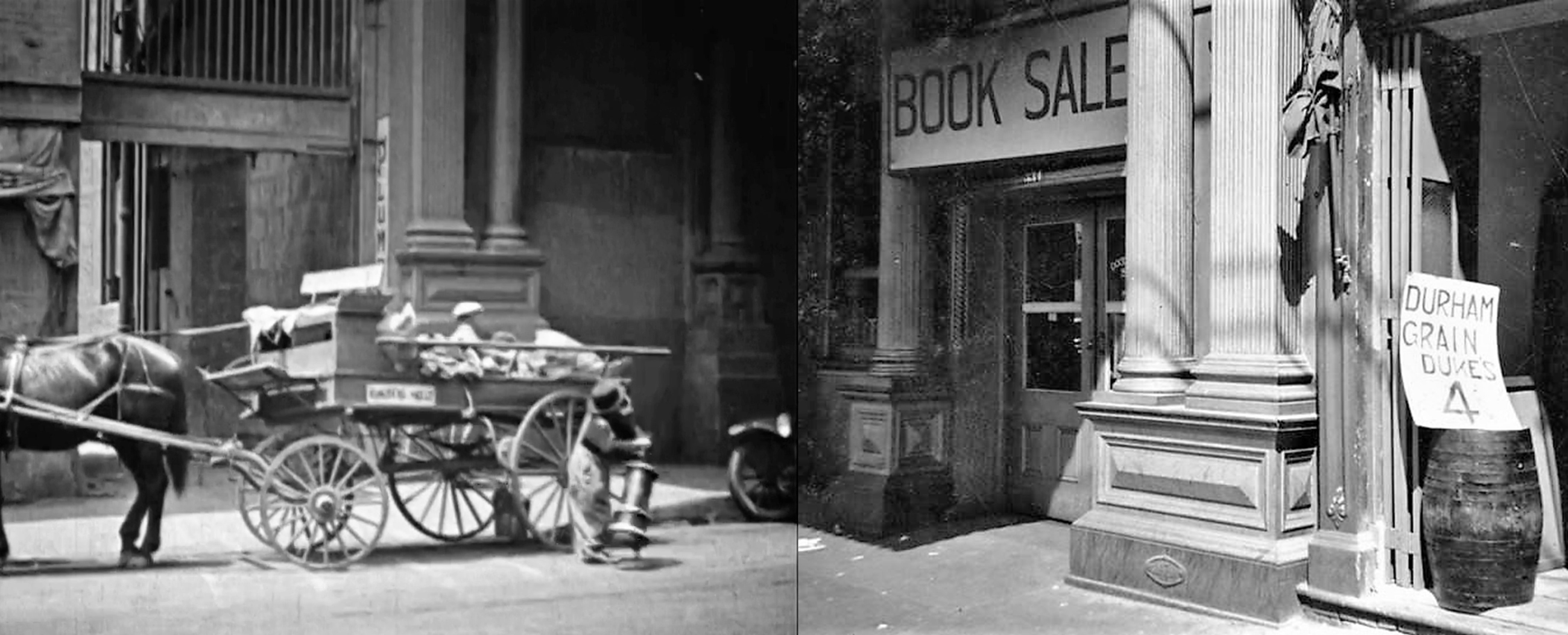 Jackie loads new merchandise onto his junk cart in front of the open gated entrance. His frame forms a virtual panoramic view of the Baker Building, as Buster flees the police running south down Arcadia from Main St towards Los Angeles St during Cops (1922). Mark astutely reports that Eddie Cline, Buster’s co-director for many of his early shorts, also directed The Rag Man. So Eddie must have felt quite at home here, after already directing Buster’s chase scene at the same spot.