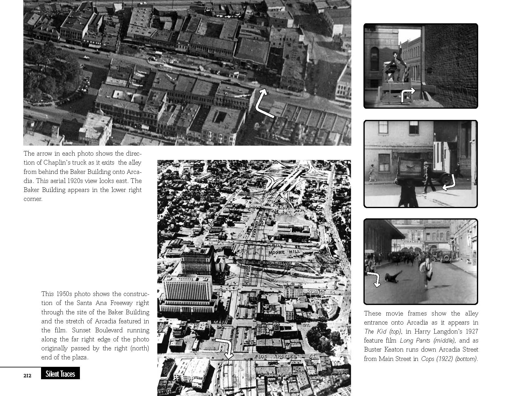 Looking north from Arcadia Street and Sanchez Alley towards the Plaza de Los Angeles. The inset photo is the Baker Building facing Main. These early streets appear in dozens of films, including Chaplin’s Police (1916), and Keaton’s Neighbors (1920), covered in great detail in my Chaplin book Silent Traces at pages 107-112. To whet your appetite here below are pages 211 and 212 discussing Arcadia and the Baker Building.