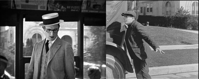 Sherlock’s assistant Gillette (played by Ford West) pulls Buster over at 220 S Lucerne, a block to the south, behind from where Murphy is supposedly spying on them. More incongruous, the shot including all three actors (left), as Buster leaps onto the bike and they ride off, was filmed several blocks away, north of Beverly looking south down Larchmont.