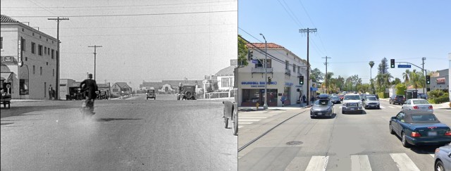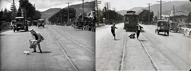 The trolley was a studio prop towed north past 162 S Lucerne Blvd, also seen here during Sherlock Jr. (1924). The evil henchman appearing to spy on Buster up the street, character actor Steve “Broken Nose” Murphy, is actually looking the wrong way.