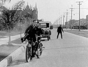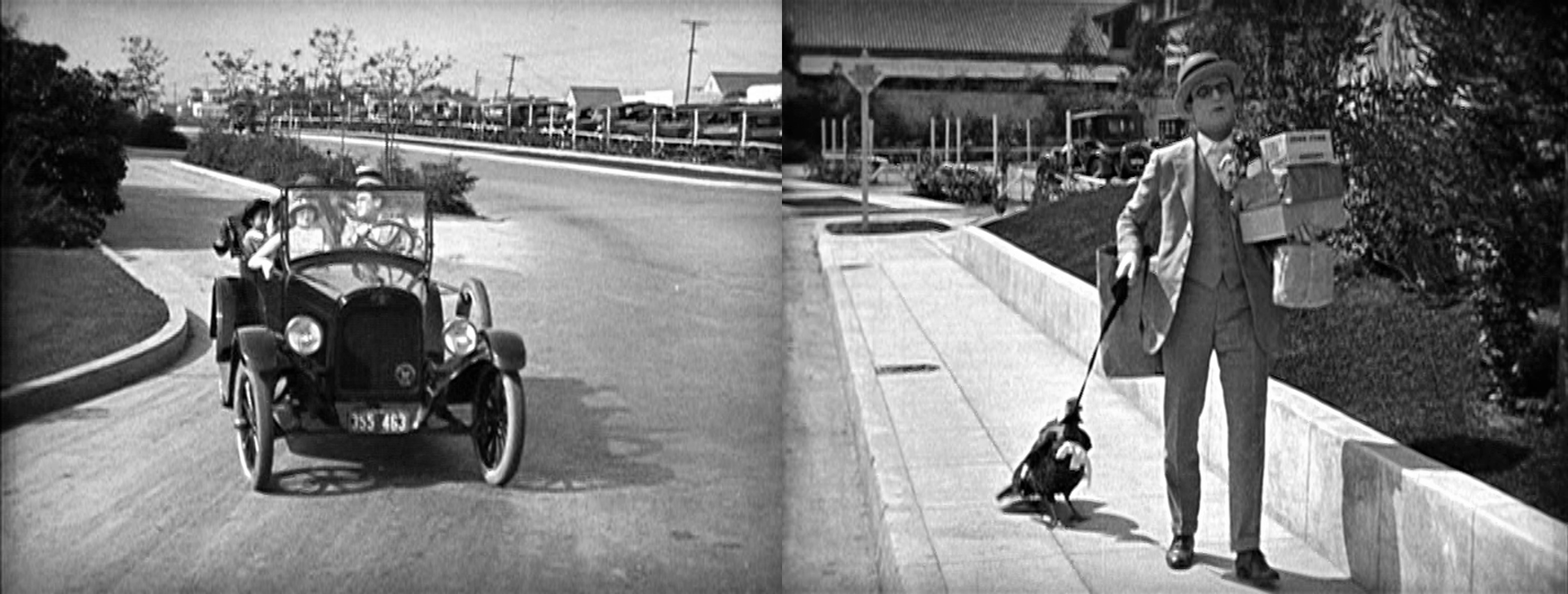 Sherlock’s assistant Gillette (played by Ford West) pulls Buster over at 220 S Lucerne, a block to the south, behind from where Murphy is supposedly spying on them. More incongruous, the shot including all three actors (left), as Buster leaps onto the bike and they ride off, was filmed several blocks away, north of Beverly looking south down Larchmont.