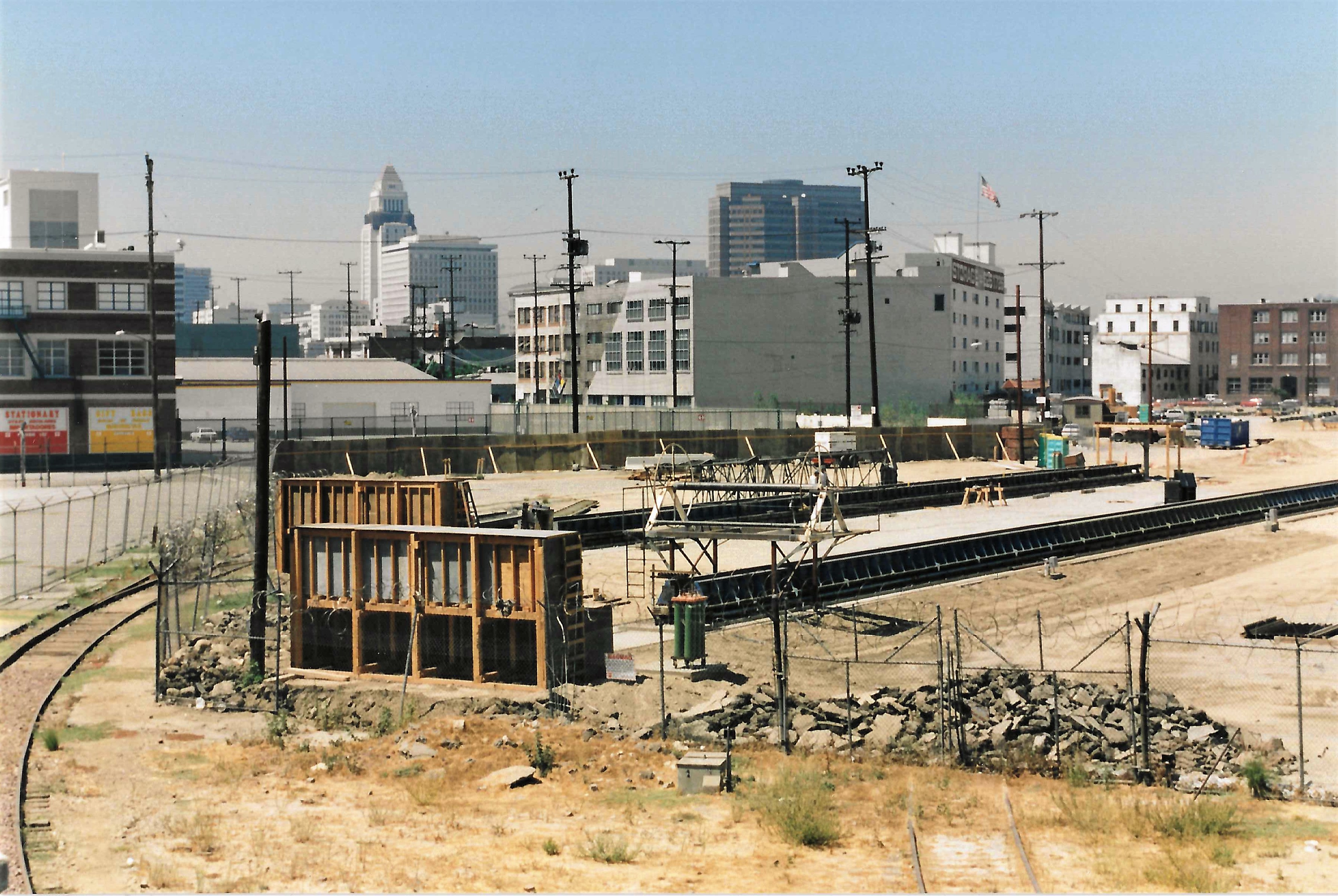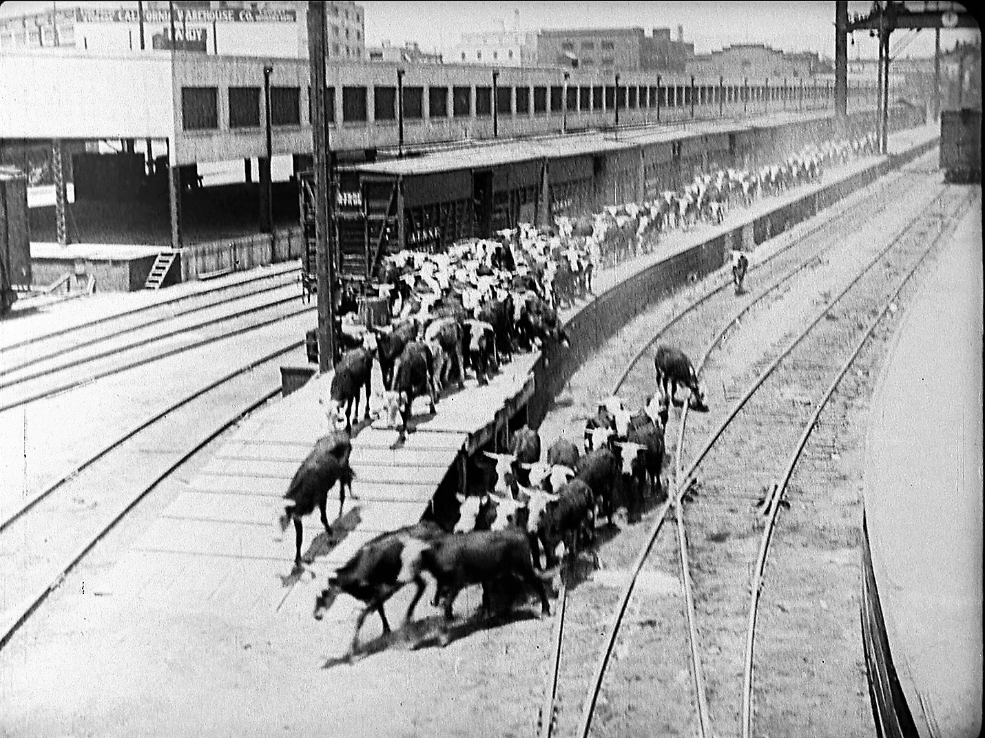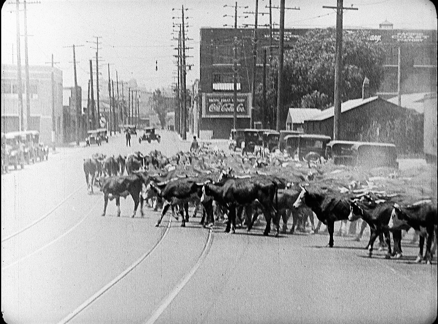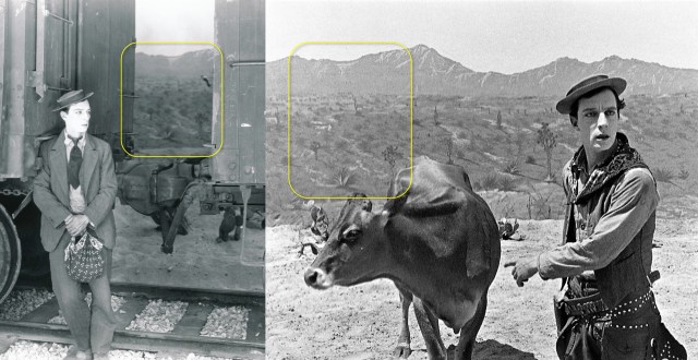 Though considered a lesser Keaton film, Go West remains a staggering accomplishment. Think of the logistics. Buster filmed for weeks in the Arizona desert, hundreds of miles from home, while enduring the summer heat. Buster worked with several farm animals, training them to perform on command, and wrangled a herd of at least 100 live cattle on real downtown streets, at 4th and Merrick near the former LA Santa Fe freight yard (above). Buster staged many sequences atop moving trains, presaging the even more elaborate scenes that would appear later in The General. And last, Buster employed many special visual effects so convincingly, including the painted backdrops revealed here, we don’t even notice. It all appears effortless on the screen thanks to Buster Keaton’s incredible talent as a comedian and filmmaker.