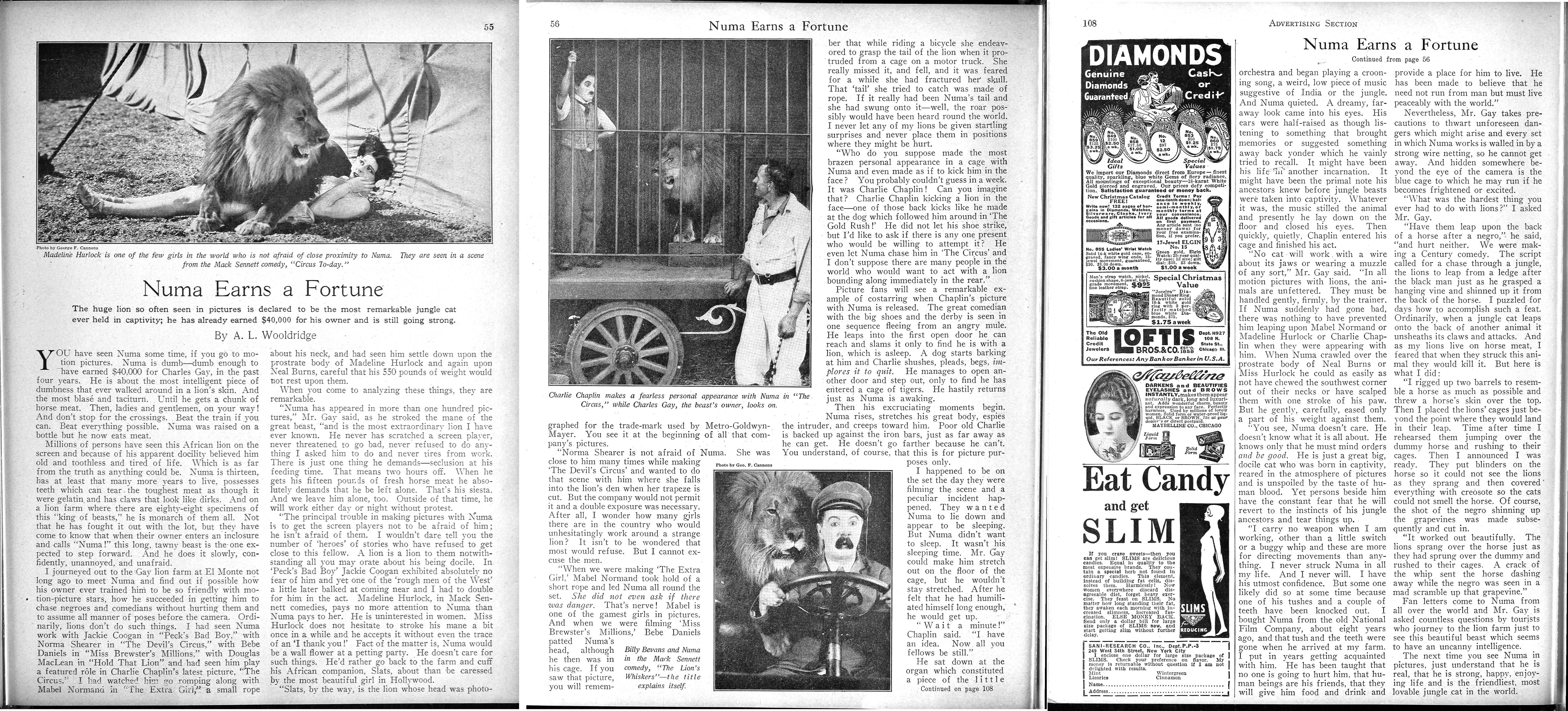 Below, the full “Numa Earns a Fortune” article, Picture Play Magazine, January 1927, page 55, click to enlarge. As you can see Numa also appeared with Charlie Chaplin in The Circus (1928).
