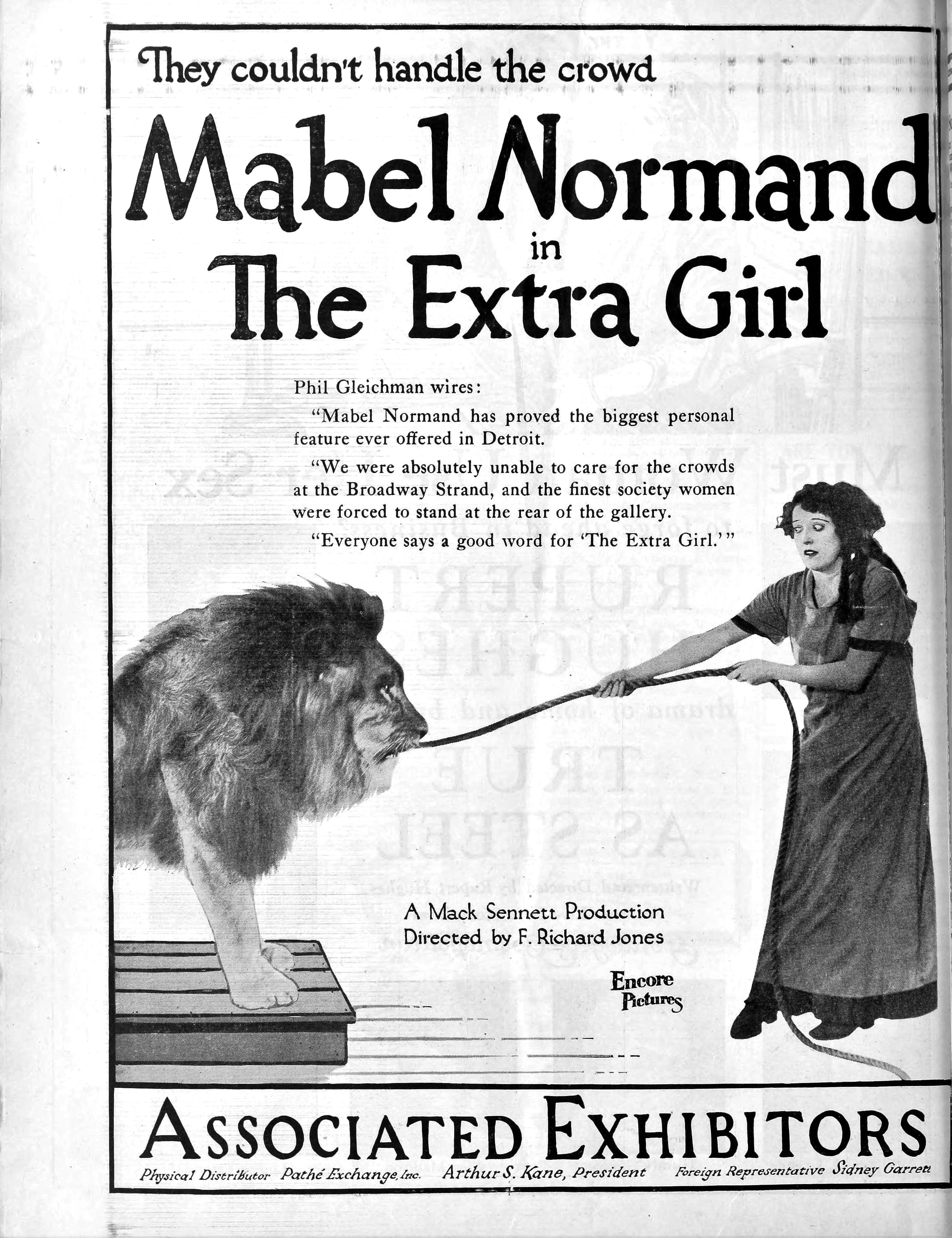 Last, during The Extra Girl (1922), Mabel plays a small-town girl/wannabe movie actress who lands a job working for a film studio wardrobe department. One of her menial tasks is tending to the studio mascot Teddy the dog, who happens to be made up that day with a lion costume. Instead, Mabel absentmindedly enters the studio’s lion cage (they all had one then, right?), and leads a real live lion for a walk around the studio as comedic mayhem ensues.