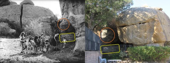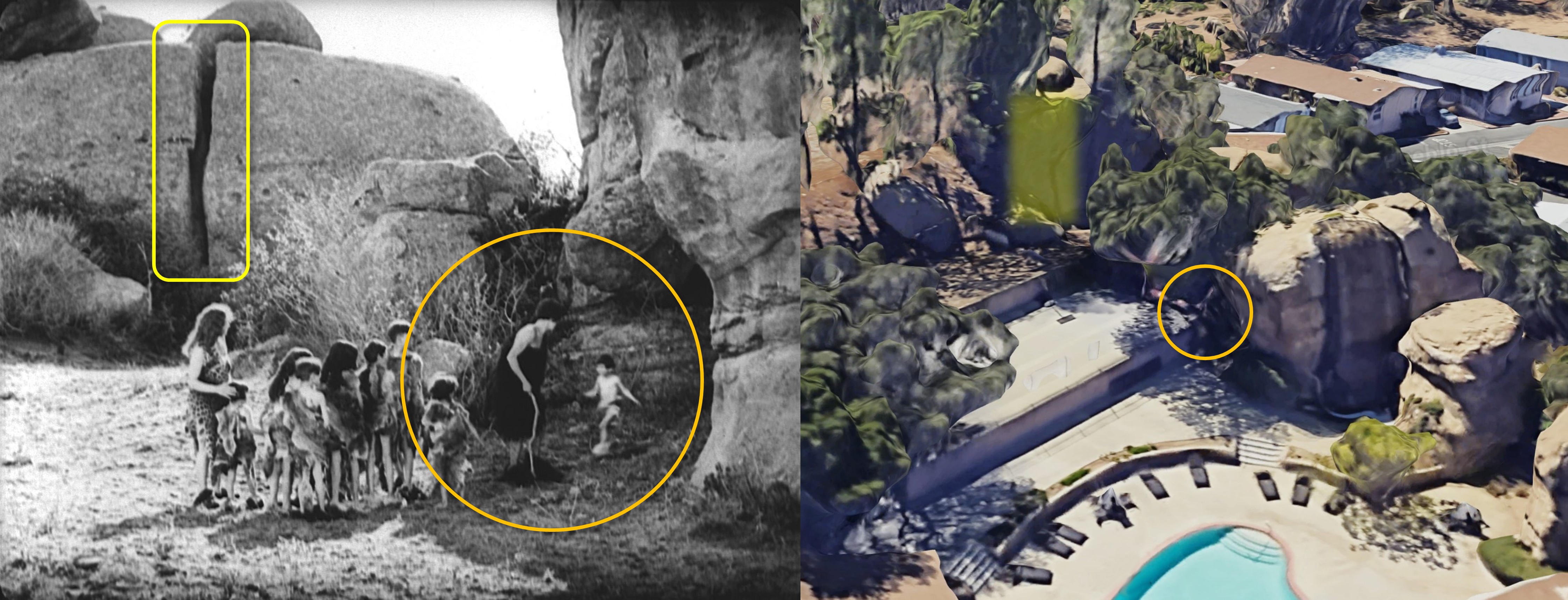 The Roman home was a backlot set, and as reported years ago in my book Silent Echoes, the domestic cave was filmed at the Iverson Ranch (details below). But I’ve sought out the Present Age bungalows for over 25 years. Then once again, suddenly, a clue from another silent film revealed this location, and more remarkably, the home is still standing unchanged. Below, does this view look familiar?