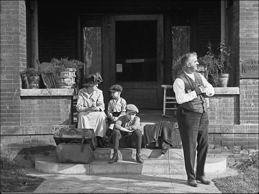 Family awaits delivery at the front stoop of the Kenmore Apartments, originally numbered 1817 Sunset, now 1827, a portion of the apartment sign reading “181* Kenmor*” appears at back. The front of the Kenmore was remodeled with streamline moderne elements in 1937 (permit issued 03-25-1937) to accommodate commercial store fronts on the ground floor. Sunset near Echo Park https://silentlocations.com/2014/04/23/chaplin-100-years-ago-on-sunset-boulevard/