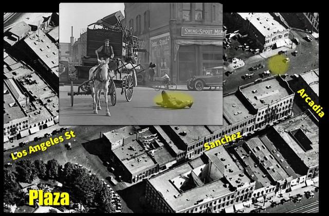 Buster makes a U-turn, knocking down a cop in the intersection of Arcadia and Los Angeles Street. The Swing Spout Measure Co, 404 Los Angeles Street, and the New Orleans Market appear at back. Old Town near Plaza