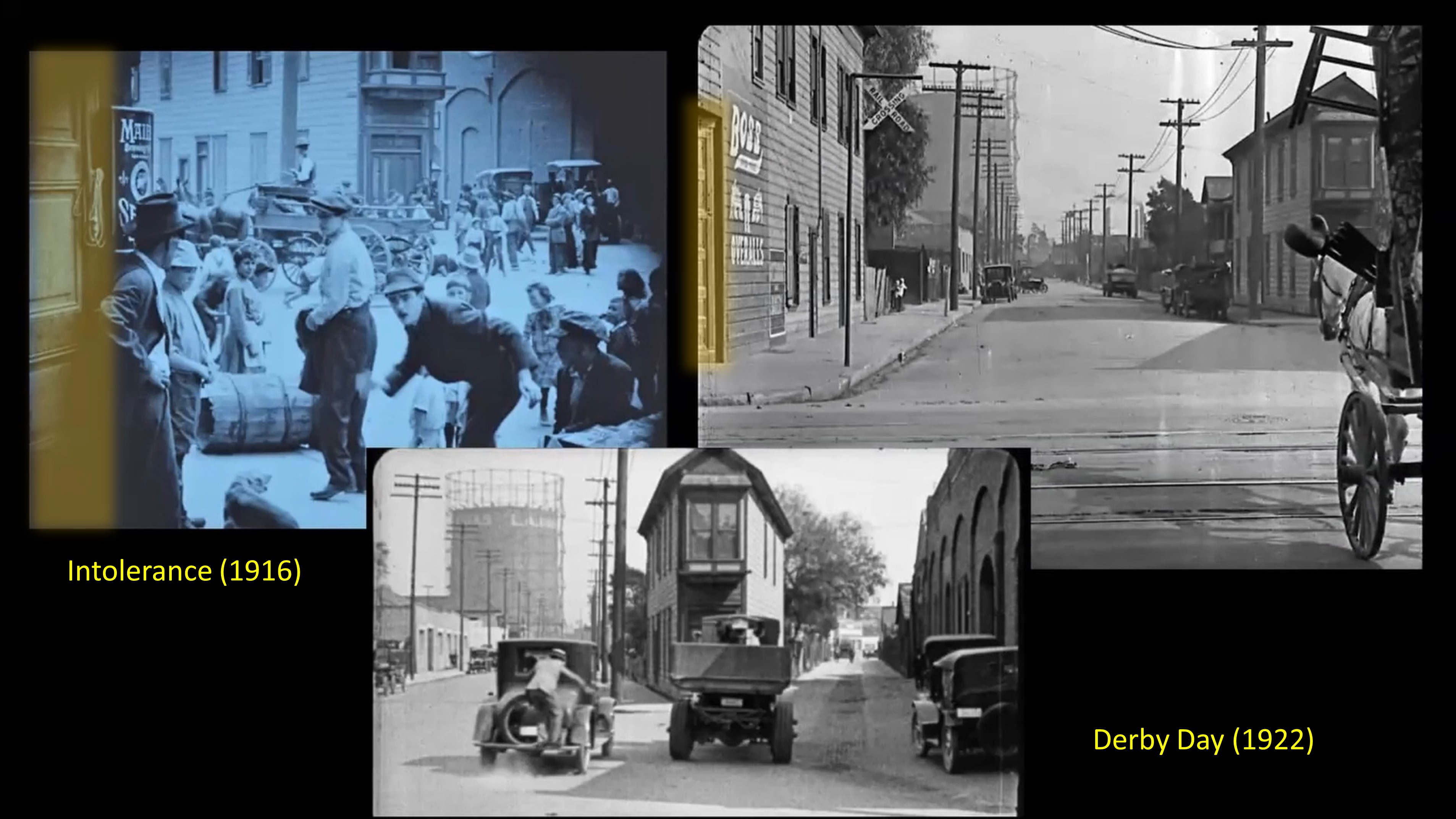 The triangle building on Labory Lane to the right appears in many early films. Charlie Chaplin filmed scenes from The Kid here, as did D.W. Griffith for Intolerance, and Monty Banks for Derby Day. Ducommun https://silentlocations.com/2022/10/29/the-kid-cops-intolerance-revealed-in-a-125-year-old-photo/