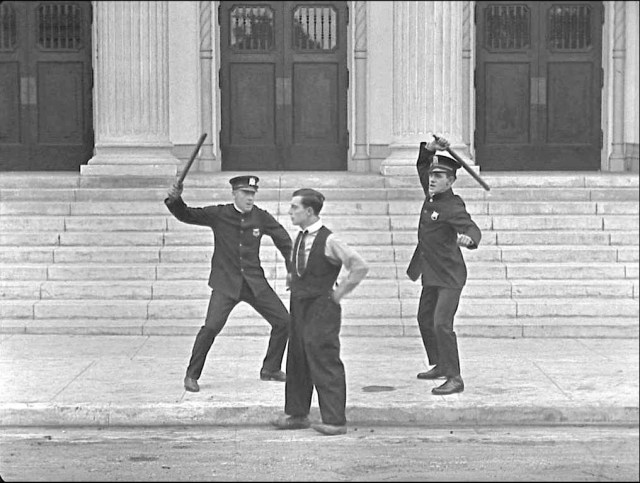 Buster lands beside two cops armed with billy clubs who miss him but knock each other out, beside the formal steps and columns of the First Baptist Church of Hollywood, now lost, that stood at the SE corner of Las Palmas and Selma, a block nearly due south of the Egyptian Theater.