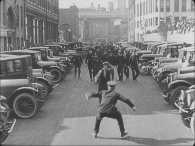 Buster walks east toward the camera down New High Street toward Temple, unaware of the mob of police emerging from the parked cars behind him, until a lone cop jumps in front. Notice the crowds of spectators in the background. Normally cars parked parallel to the curb, but here they are parked perpendicular to the curb to allow the gag to unfold. Discovered by Jeffrey Castel de Oro. Civic Center