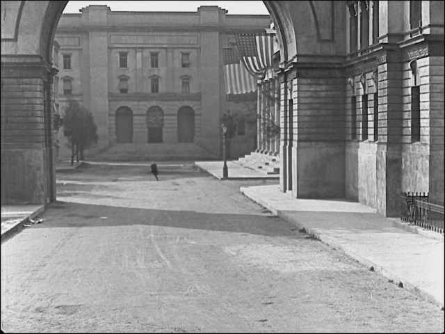 Above, Buster runs solo through the Goldwyn backlot arch, the lone police chief fails to stop him, and the army of police chase him back and forth through the arch. Culver City