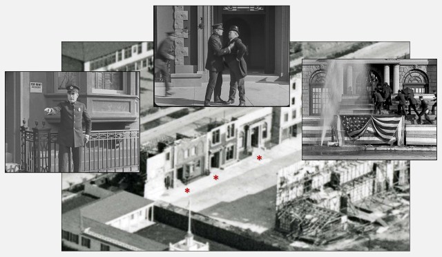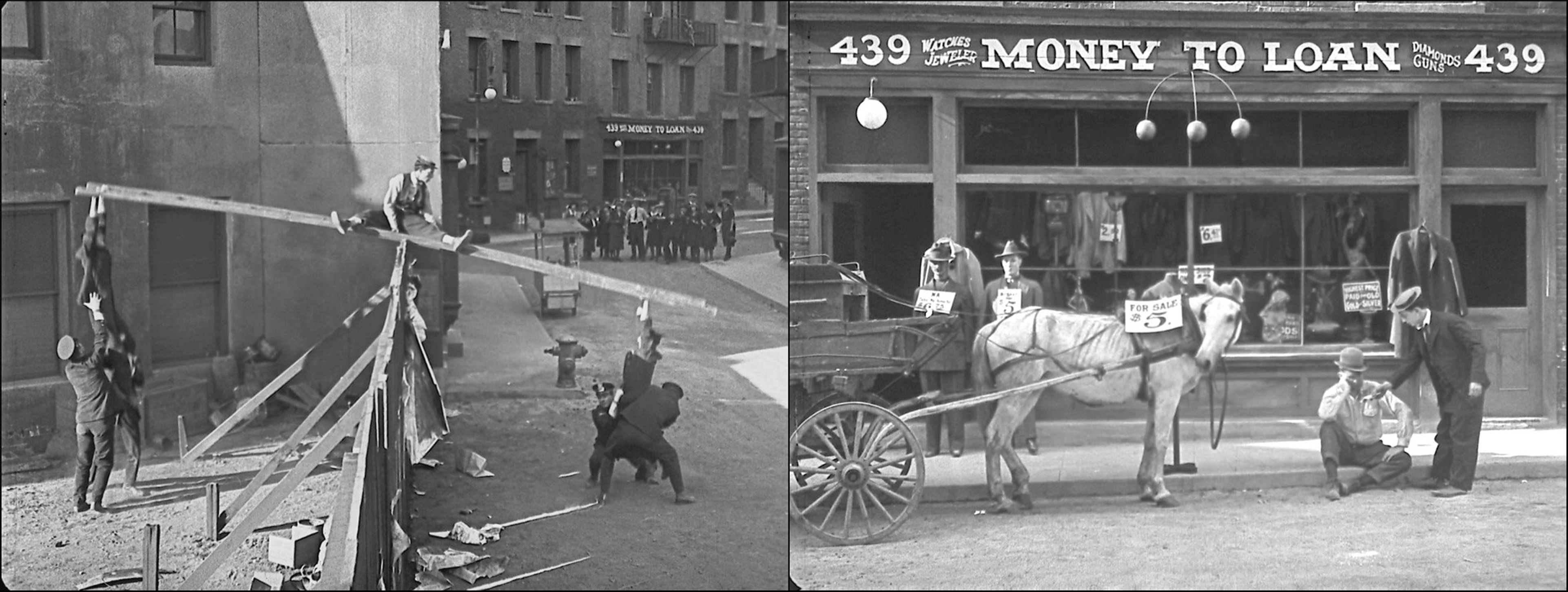 The “439 Money to Loan” store set where Buster believes he purchased a horse and wagon for $5 stands in the background. Hollywood https://silentlocations.com/2013/06/06/on-the-fence-keatons-stunts-in-cops-and-our-hospitality/