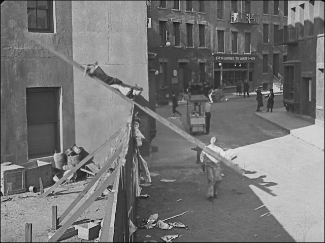 The studio had a “Y” shaped urban street set facing south. Buster lands upon Joe beside the right corner of the “Y.” The “439 Money to Loan” set stood on the main branch of the “Y,” and the teeter-totter fence stood along the left branch of the “Y.” The same right corner set appears behind street-sweeper Buster during Day Dreams. Hollywood