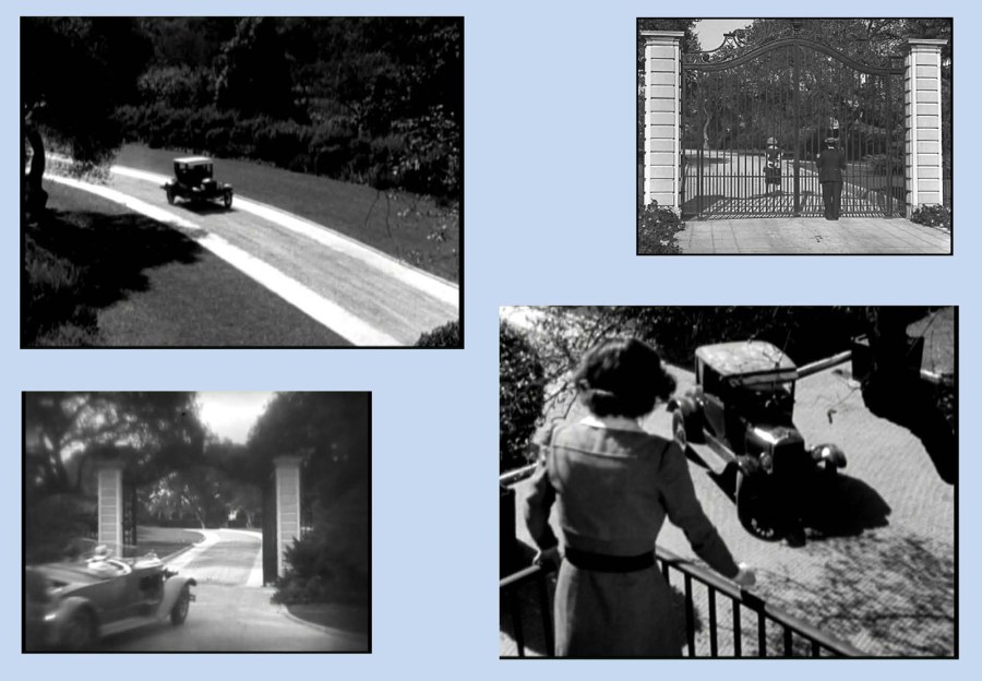The upper left and lower right images from Finishing School suggest the full length of the driveway, which appears from the gate in Cops, upper right, and in the William Haines comedy-romance Spring Fever (1927), lower left.